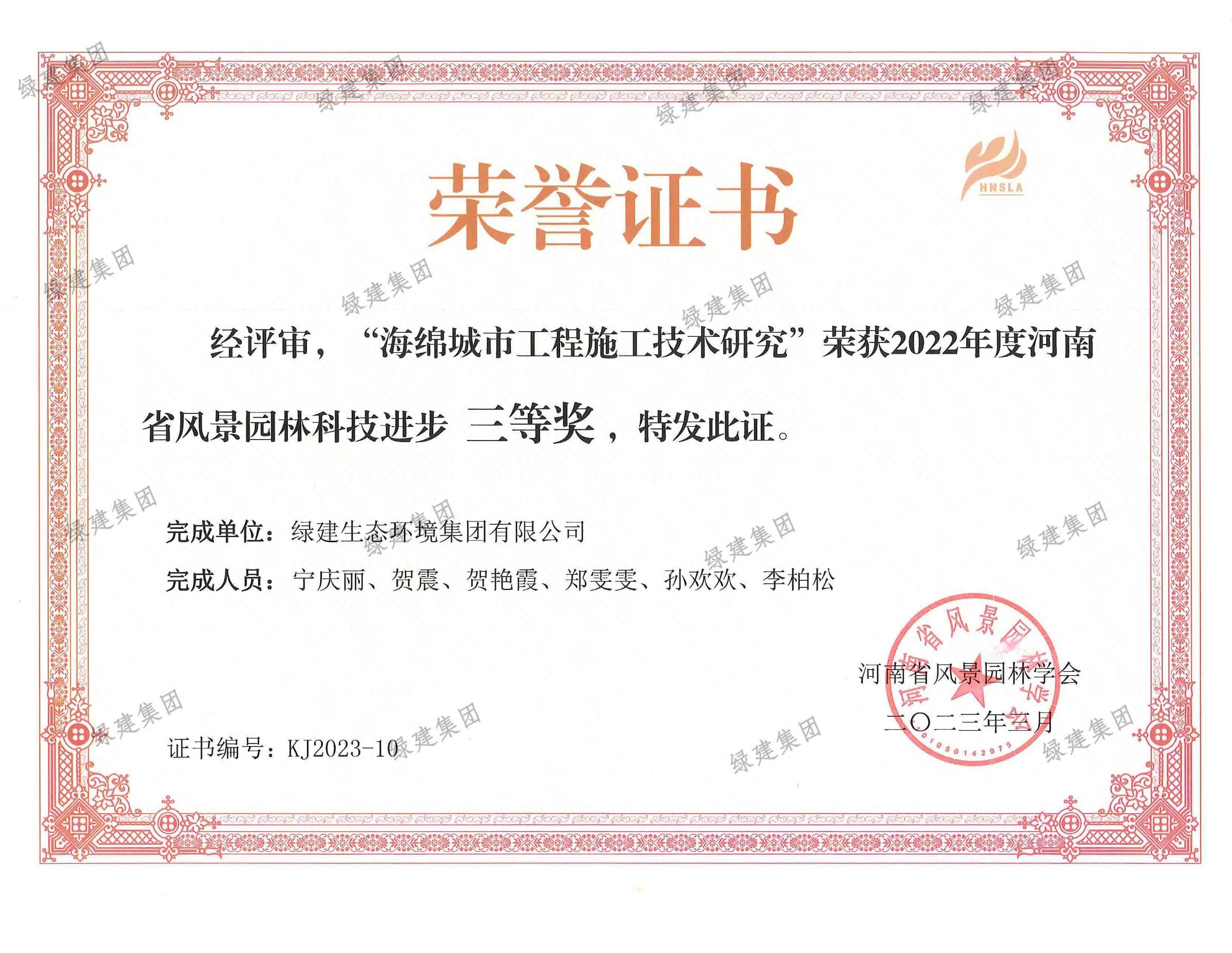 22年度海綿城市工程施工技術研究科技進步獎三等獎