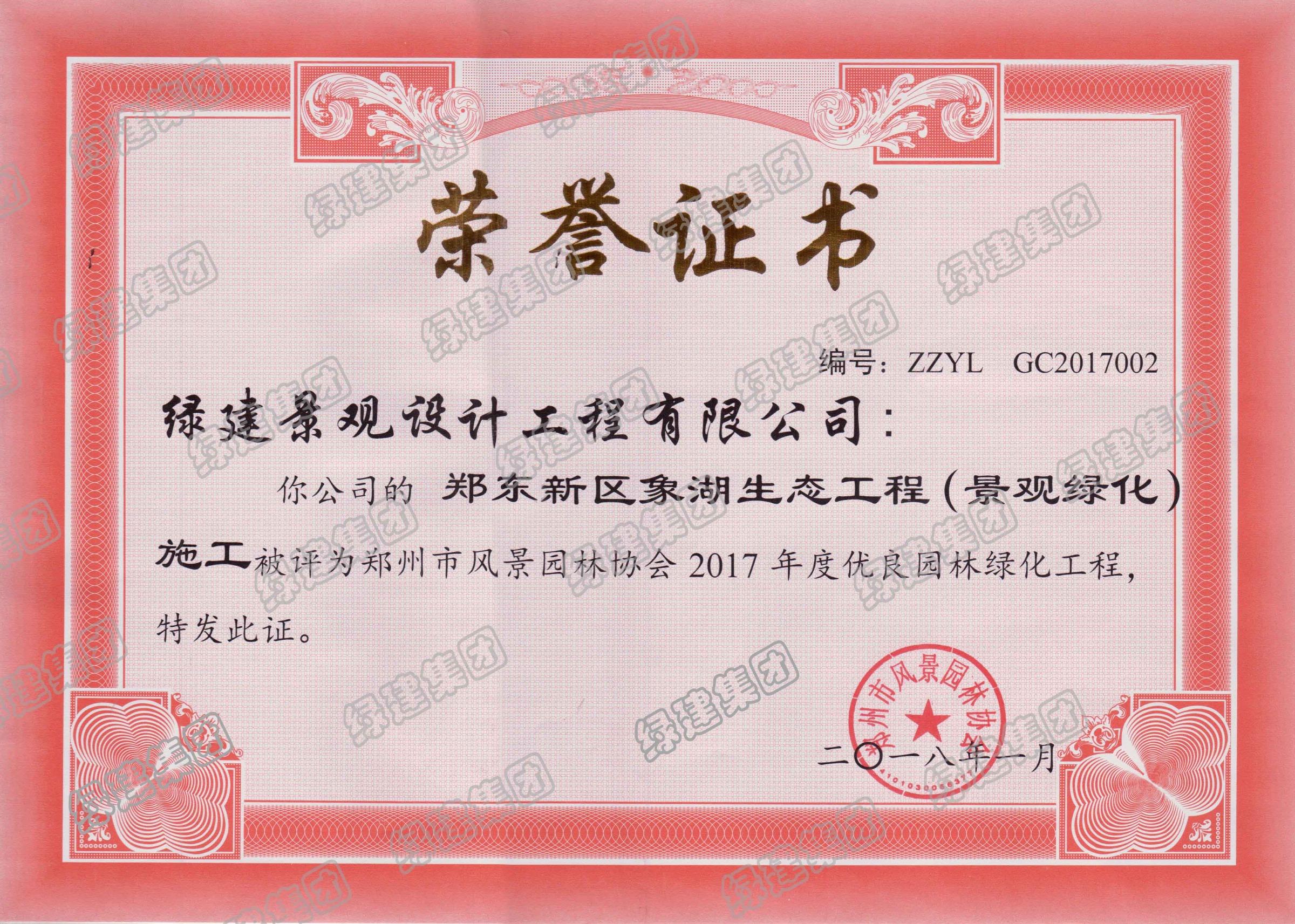 鄭東新區(qū)象湖榮獲鄭州市風(fēng)景園林協(xié)會2017年度優(yōu)良園林綠化工程